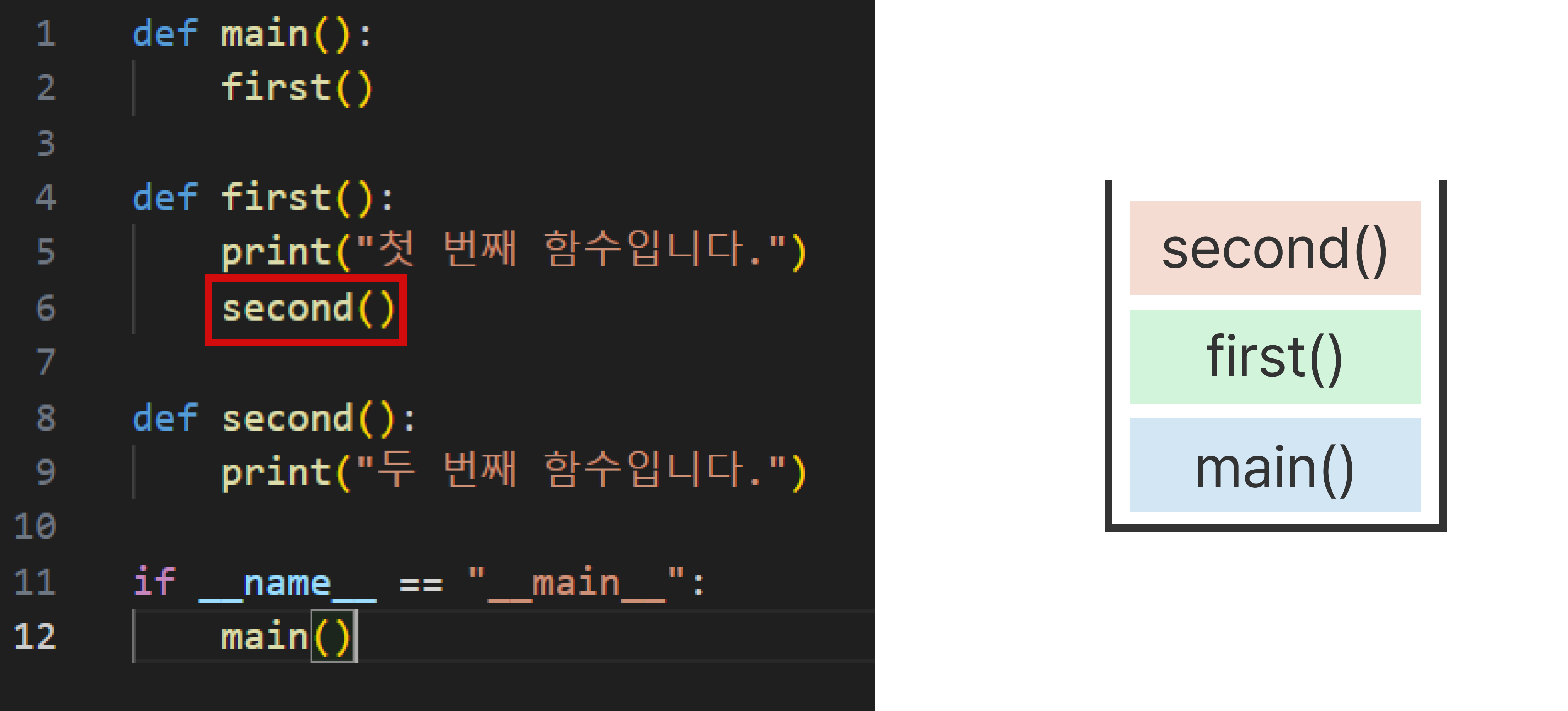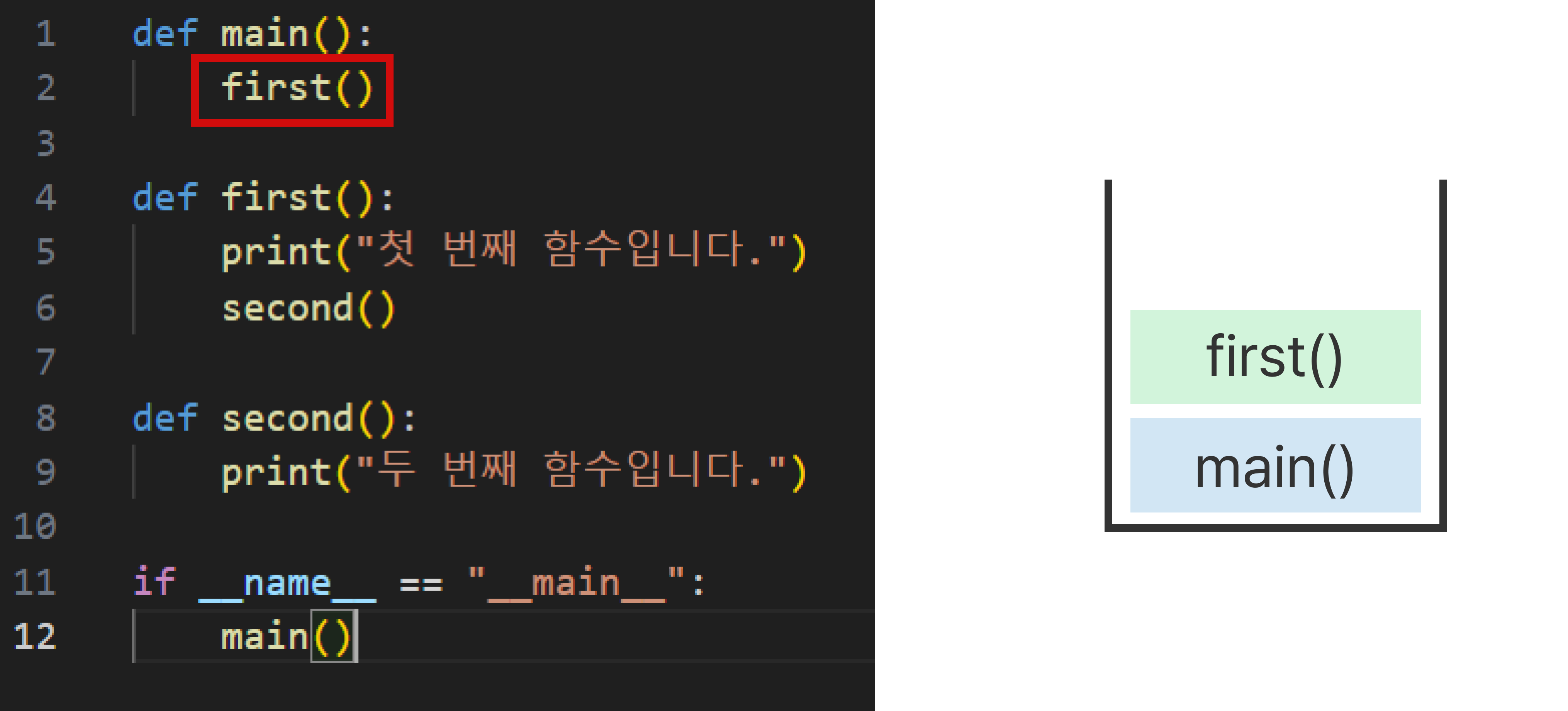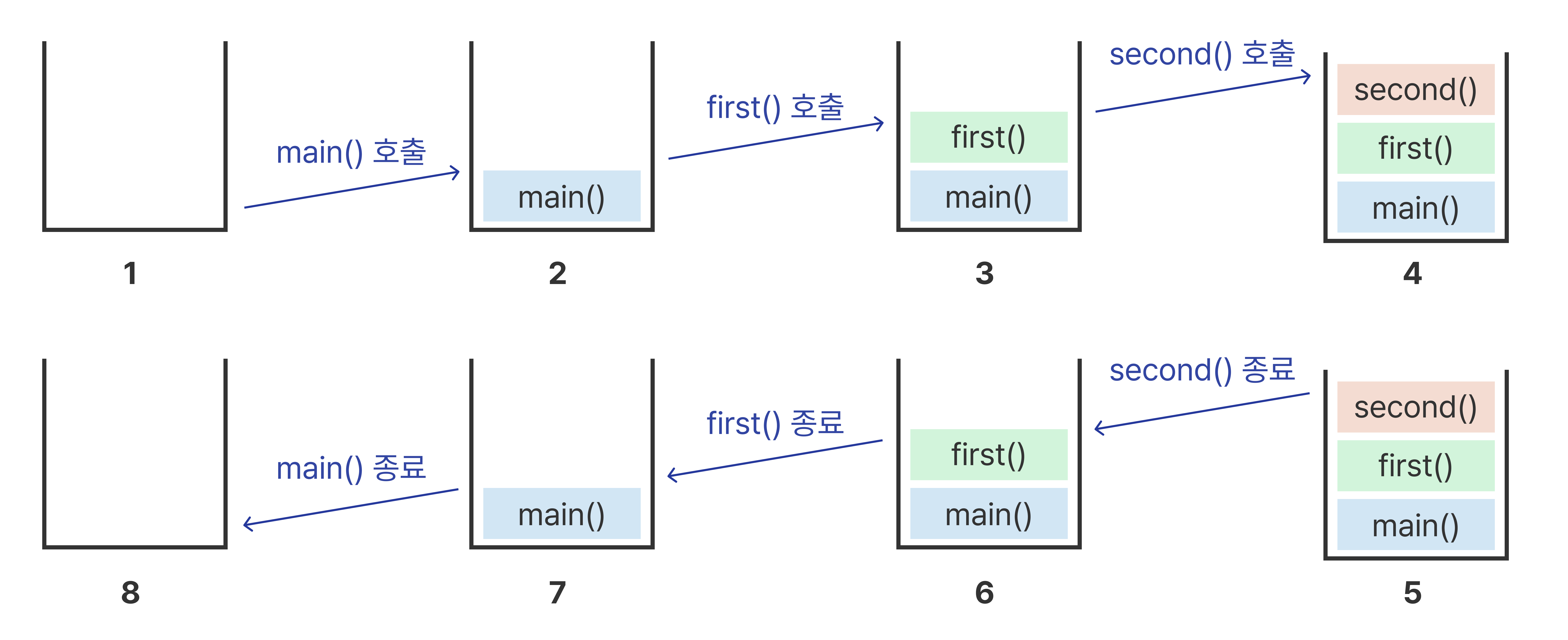 first()λ main()μμ νΈμΆλλ©°, second()λ first()μμ νΈμΆλκ³ μλ€.