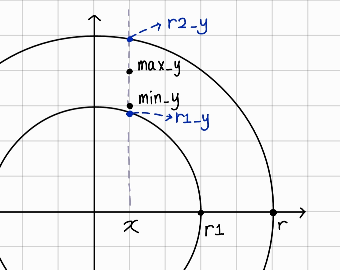 반복문을 줄이기 위해 각 x 좌표에 대한 두 원의 y 좌표를 각각 구하여 해당 구간 사이의 점 개수를 구했다.